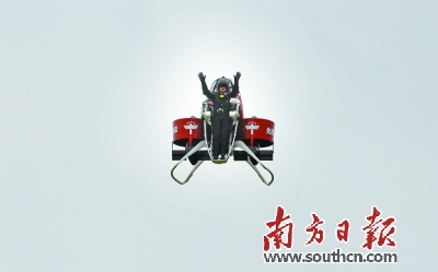7日,光启马丁飞行喷射包在深圳欢乐海岸上演“未来飞行秀”。