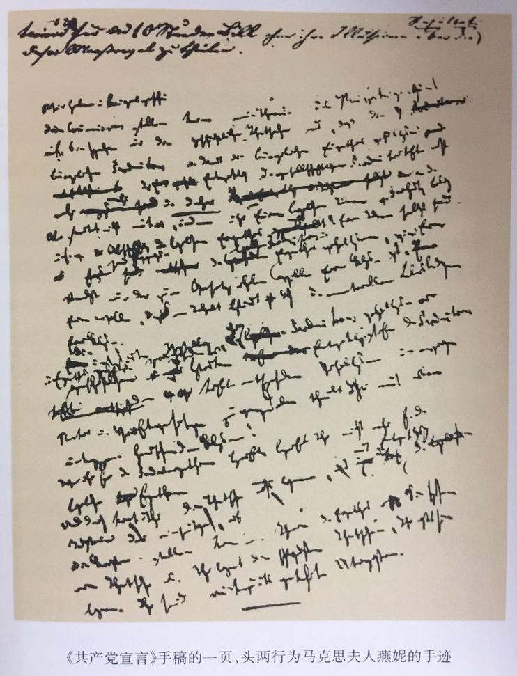 《共产党宣言》手稿的一页,头两行为马克思夫人燕妮的手迹